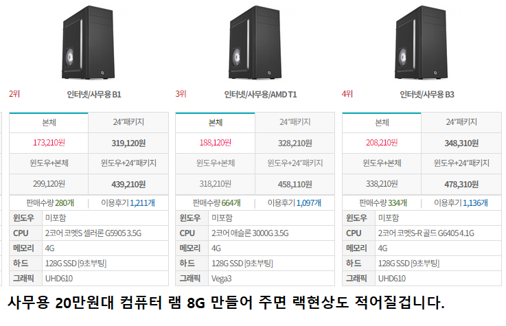 사무용 컴퓨터로는 램 8G 최신 CPU 정도면 20만원대면 충분합니다. 창 50개 유튜브 4K 영상을 보면서 간단한 작업까지
